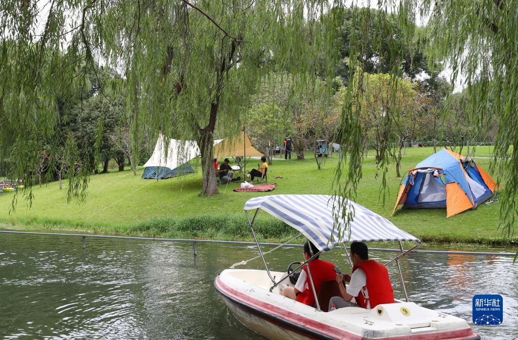 10月4日,在上海閔行體育公園,游船從岸邊露營地旁劃過。