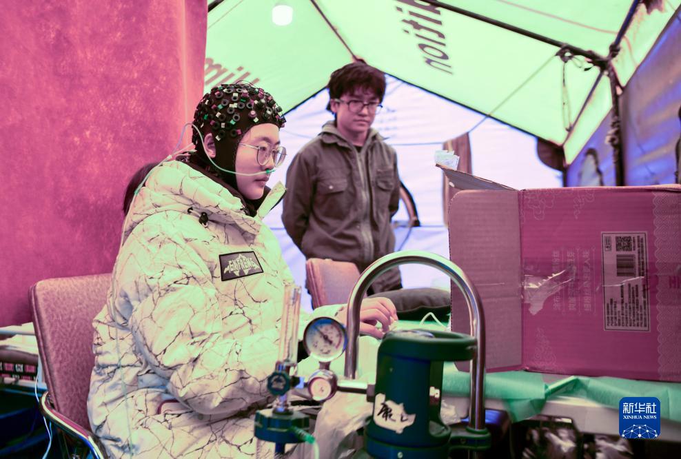 在卓奧友峰登山大本營,科考隊員(前)佩戴全腦彈性測試帽,測試有氧和無氧狀態(tài)下的人體認知能力(9月29日攝)。
