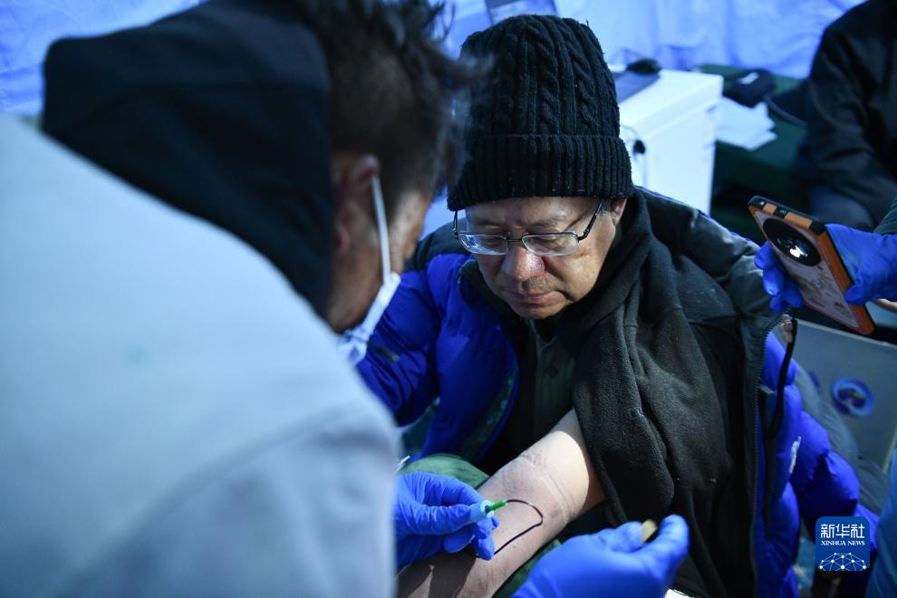 中科院院士朱彤(右)在采集血樣用于急進高原人群健康研究(10月1日攝)。