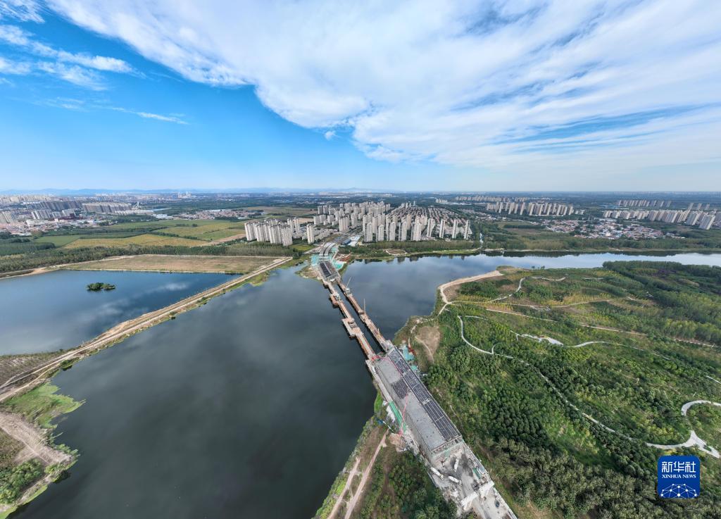 10月4日拍攝的廠通路潮白河大橋施工現場(無人機照片)。