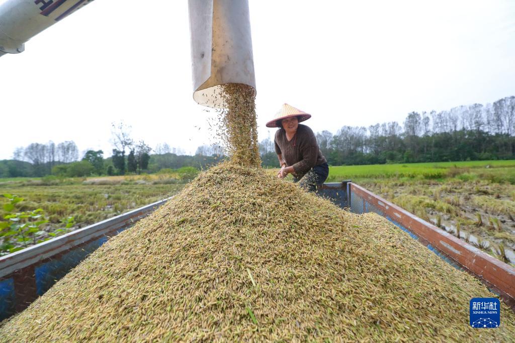 10月5日,在河南省信陽(yáng)市光山縣羅陳鄉(xiāng)張樓村,一家合作社社員在搶收水稻。