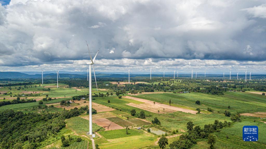 這是10月5日在泰國猜也蓬府拍攝的由中國金風科技提供的風力發電機(無人機照片)。