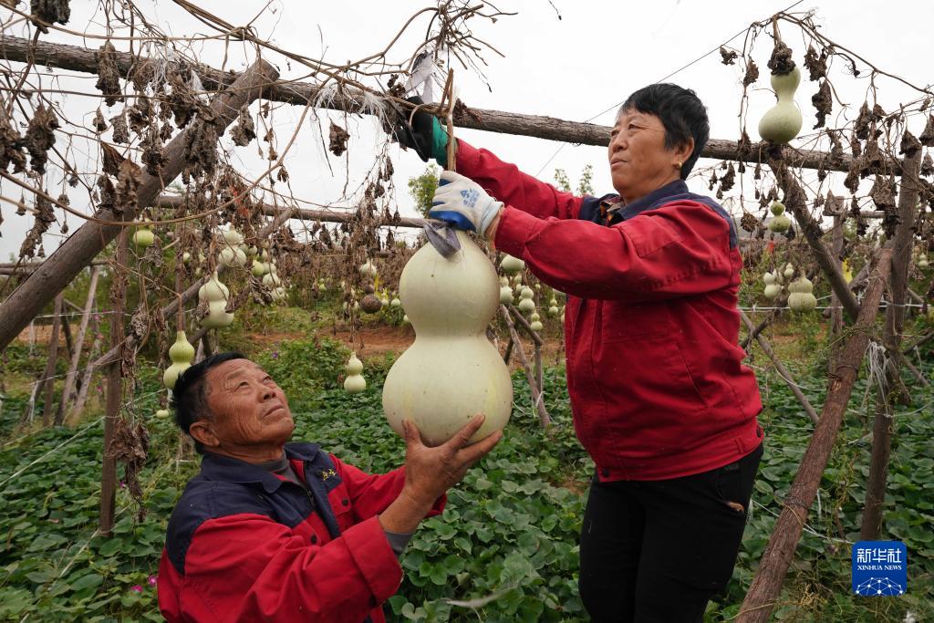 10月5日,河北省邢臺市信都區(qū)會寧鎮(zhèn)張爾莊村村民在葫蘆園內(nèi)采摘葫蘆。