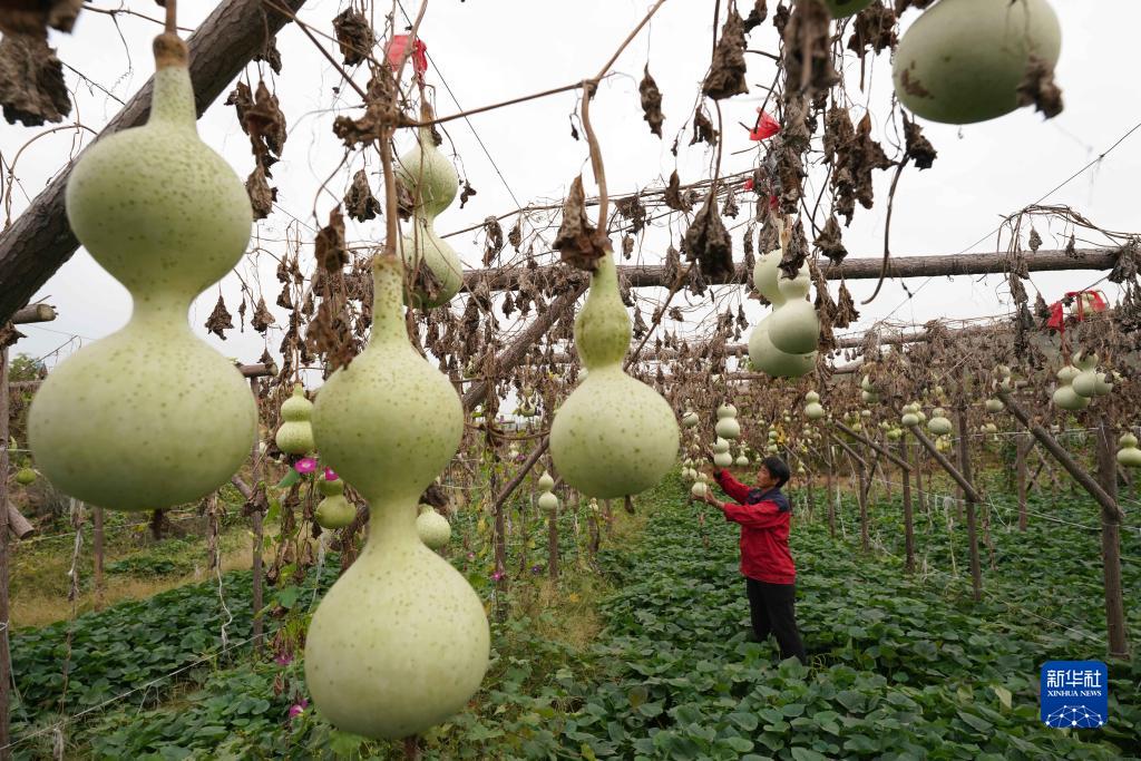 10月5日,河北省邢臺市信都區會寧鎮張爾莊村村民在葫蘆園內采摘葫蘆。