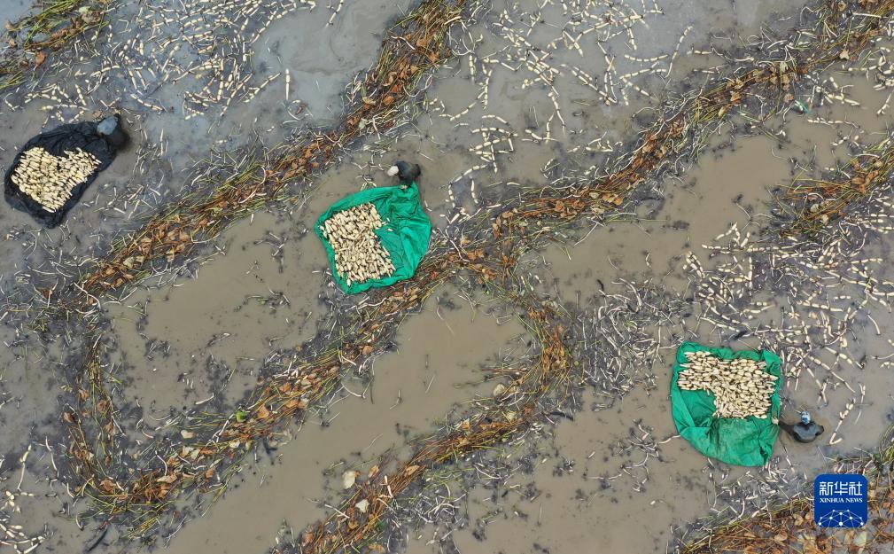 10月5日,河北省新河縣西流鄉西董村一家蓮藕種植合作社的社員在收獲蓮藕(無人機照片)。