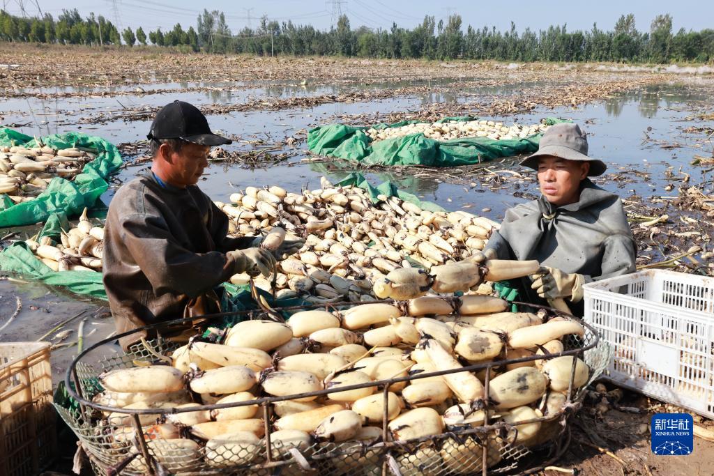 10月5日,河北省新河縣西流鄉(xiāng)西董村一家蓮藕種植合作社的社員在分揀收獲的蓮藕。