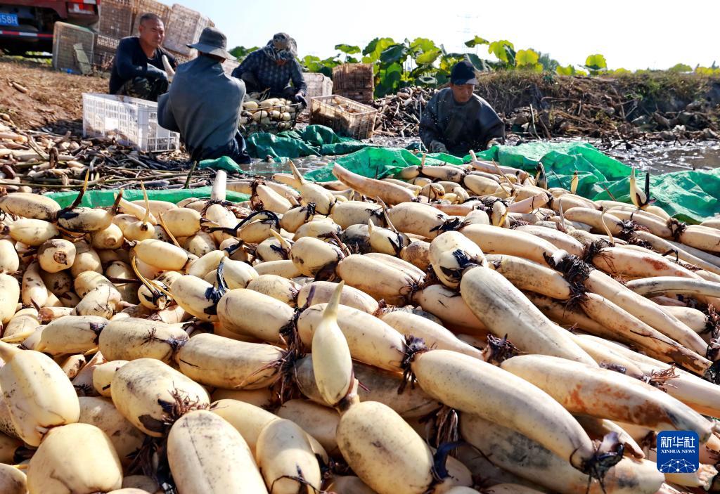 10月5日,河北省新河縣西流鄉西董村一家蓮藕種植合作社的社員在分揀收獲的蓮藕。