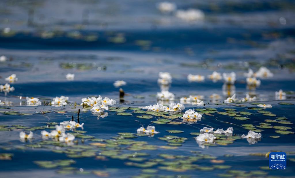 在云南大理洱海中開放的海菜花(2020年5月31日攝)。在云南大理洱海,被視為“水質風向標”的海菜花一度難覓蹤跡。2016年底,云南省開啟搶救式保護工作,全面打響洱海治理攻堅戰。如今海菜花又在清澈的湖水中隨波蕩漾。