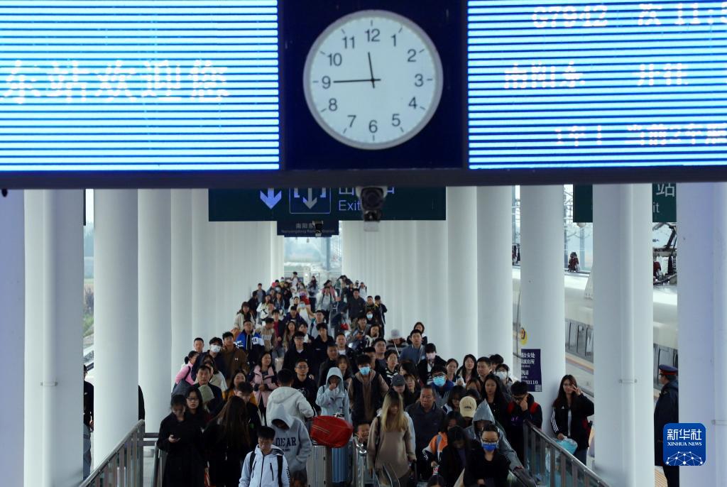 10月6日,在鄭渝高鐵南陽東站,旅客有序進站。