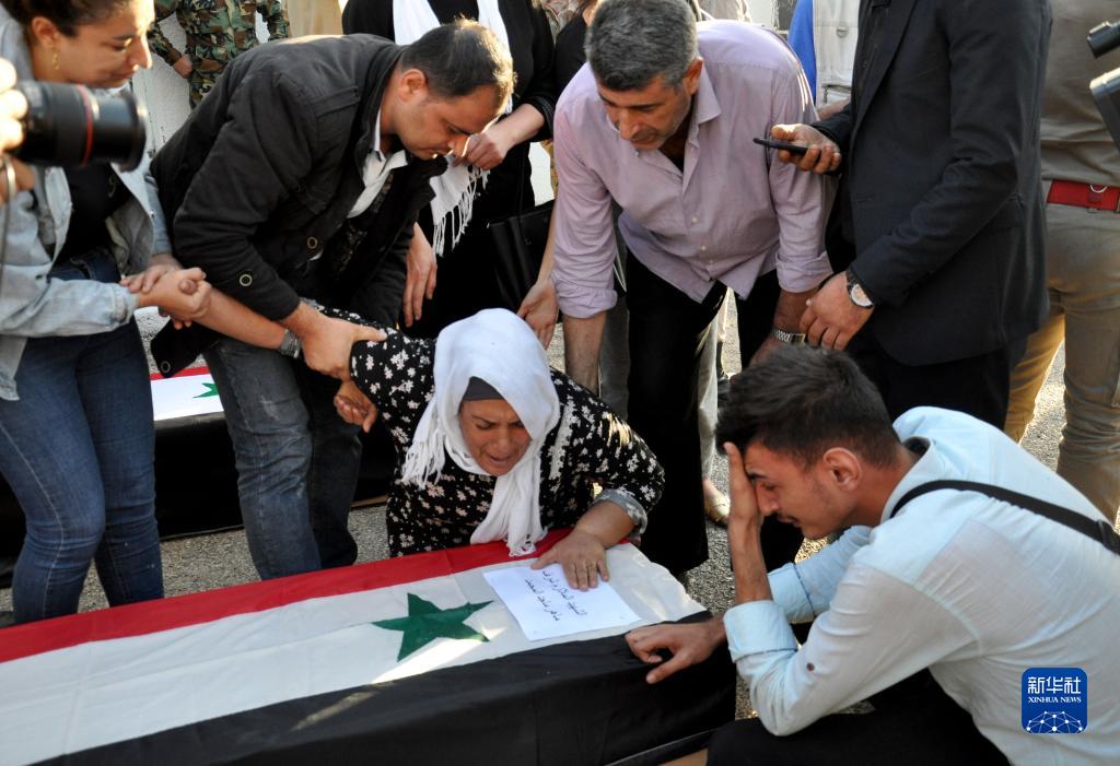 10月6日,無人機襲擊遇難者家屬在敘利亞霍姆斯參加親人葬禮時哭泣。