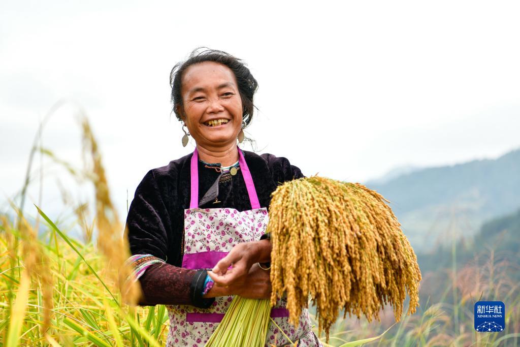 10月6日,農(nóng)民在貴州省黎平縣雙江鎮(zhèn)黃崗村展示收割的稻谷。