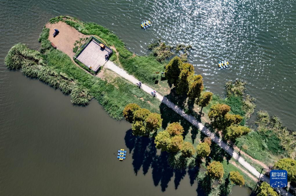 10月6日,市民在由滇池綠道串聯(lián)的干尾溝濕地公園游覽(無人機照片)。