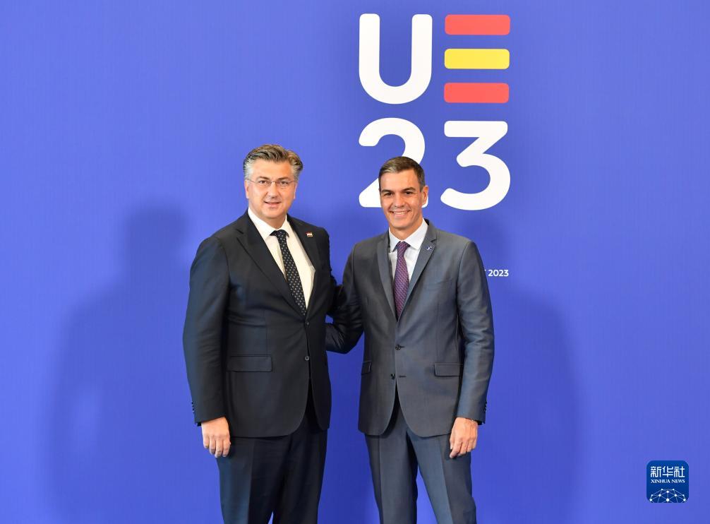 10月6日,在西班牙南部城市格拉納達,前來參加歐盟領導人非正式會議的克羅地亞總理普連科維奇(左)與西班牙代理首相桑切斯致意。