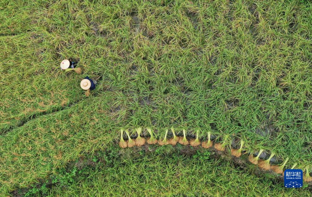 10月7日,村民在貴州省黔東南苗族侗族自治州從江縣剛邊壯族鄉剛邊村采收糯稻(無人機照片)。