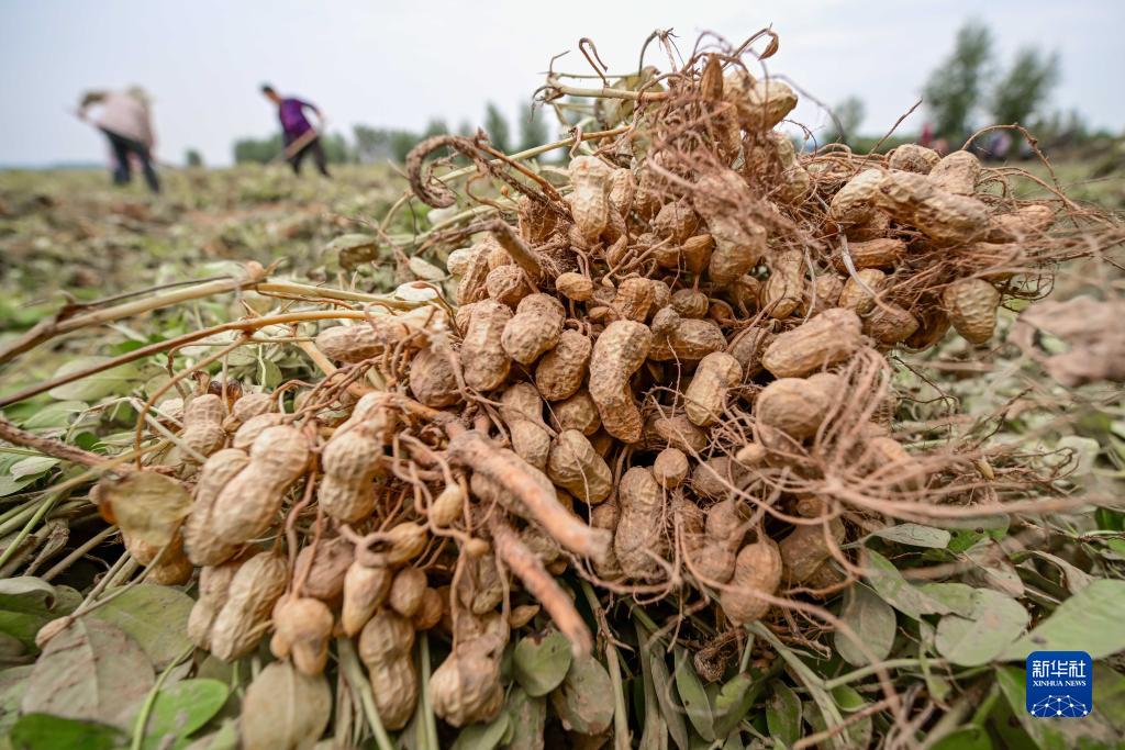 10月7日,農民在河南省洛陽市孟津區會盟鎮黃河灘搶收花生。