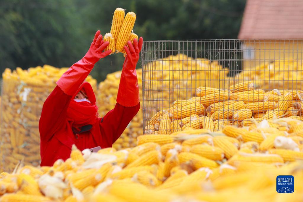 10月7日,在山東省高密市咸家社區賈唐村,農民將收獲的玉米封囤歸倉。