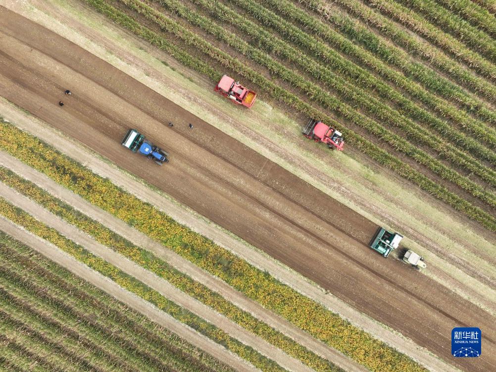 10月7日,石家莊市趙縣開展農業全程機械化三秋演示會,引導農民利用現代農機做好農事管理和高效收獲(無人機照片)。