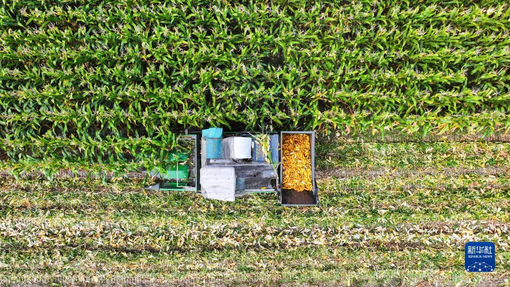 10月6日,山東省鄒平市黃山街道農(nóng)民在收獲玉米(無(wú)人機(jī)照片)。