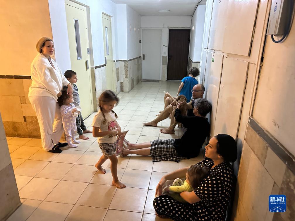 10月7日,防空警報響起后民眾在耶路撒冷一處建筑內避難。