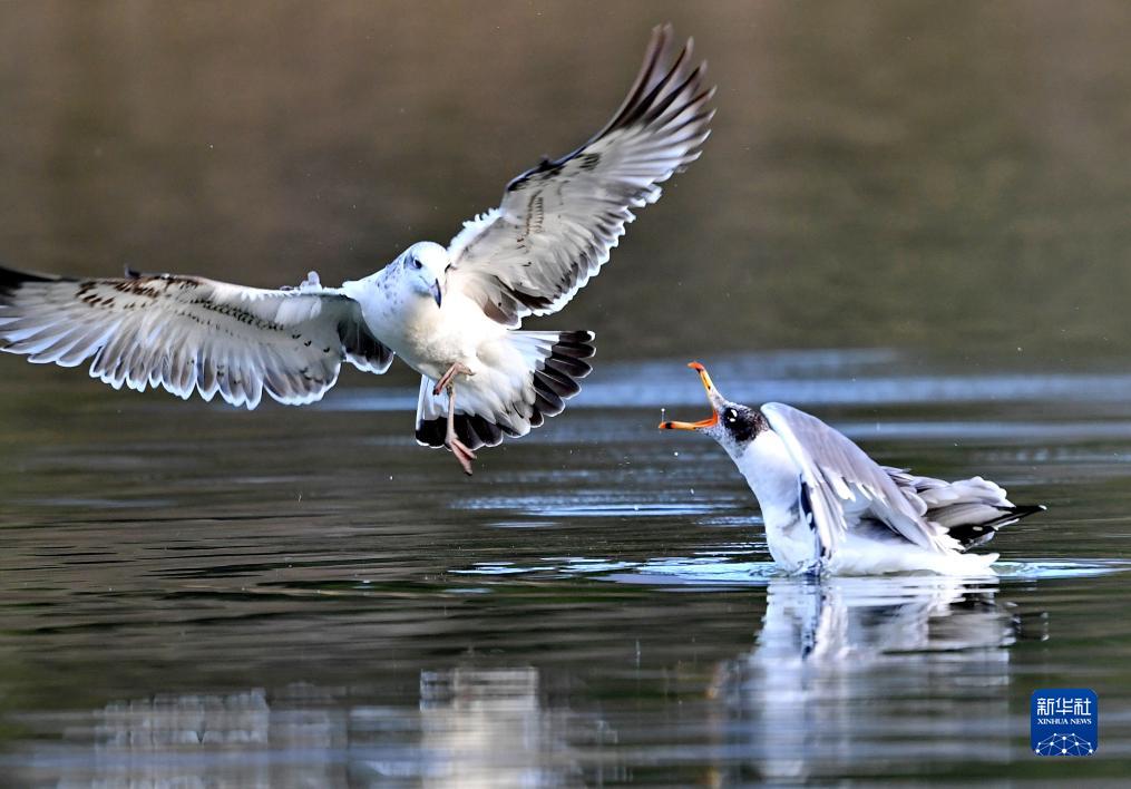 這是在西藏拉薩拉魯濕地拍攝的水面上的漁鷗(10月3日攝)。