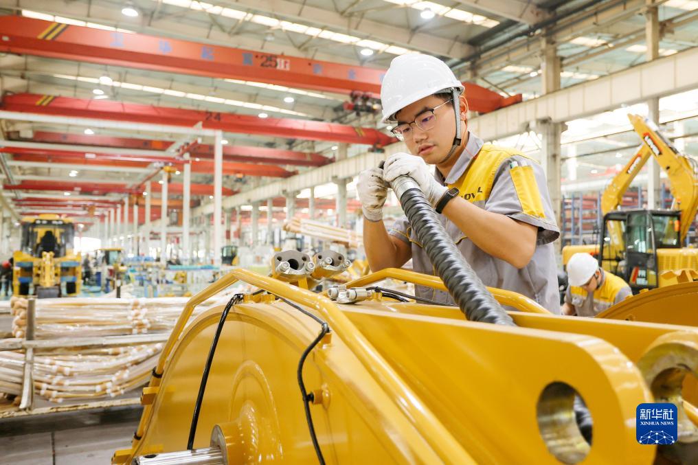 10月7日,在山東省青島西海岸新區黃島街道雷沃重工生產車間,工人在大型挖掘機生產線作業。