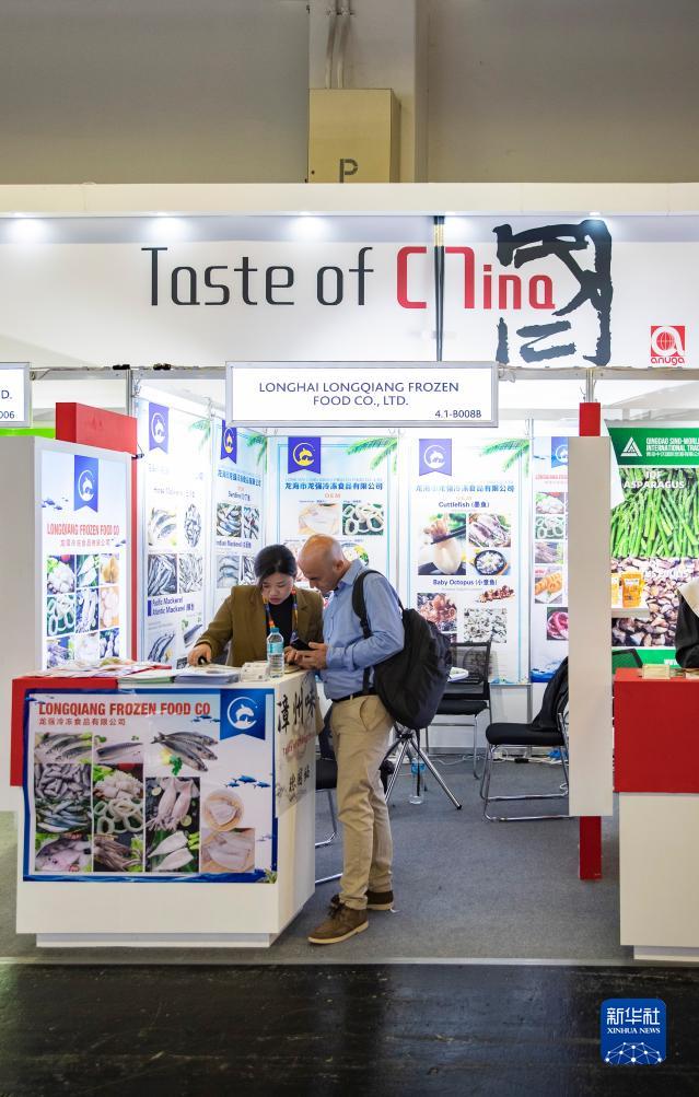 10月7日,參觀者在德國科隆國際食品博覽會的一個中國企業展臺參觀交談。新華社記者 張帆 攝