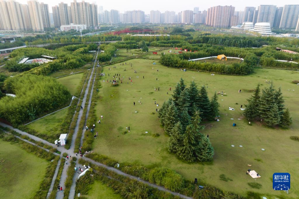 10月7日,市民在西安雁南公園內(nèi)游玩(無人機(jī)照片)。
