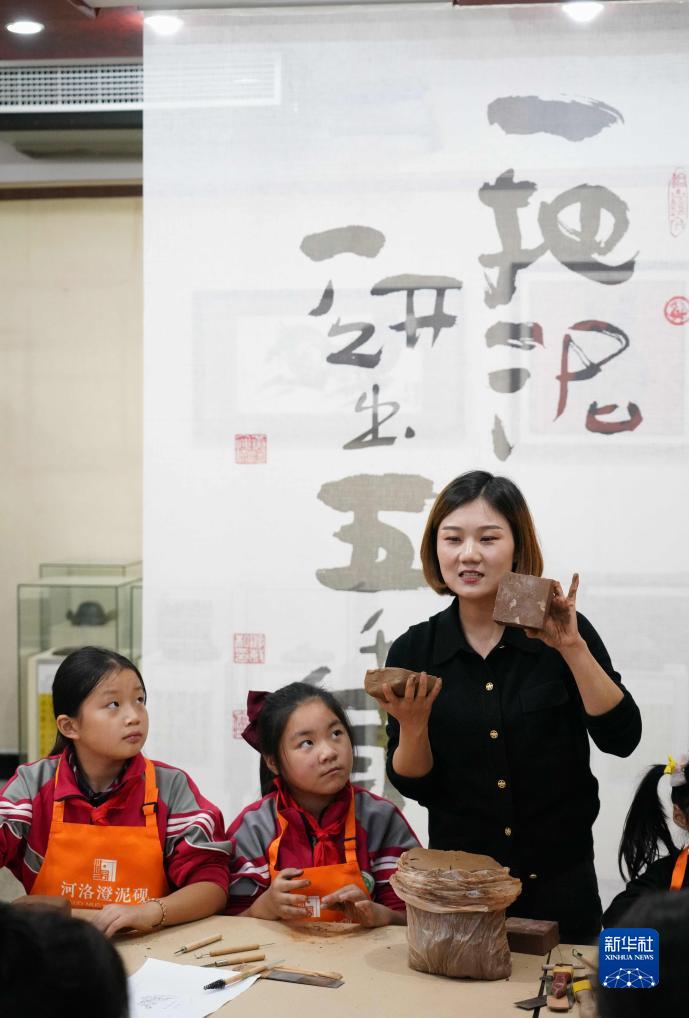 10月7日,在河南省洛陽市新安縣河洛澄泥硯藝術(shù)館,游曉曉在教小學(xué)生制作澄泥硯。