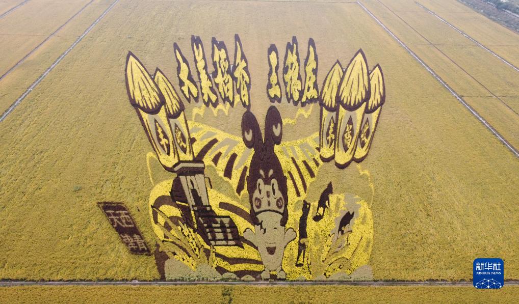 天津市西青區王穩莊鎮種植的稻田畫(10月8日攝,無人機照片)。