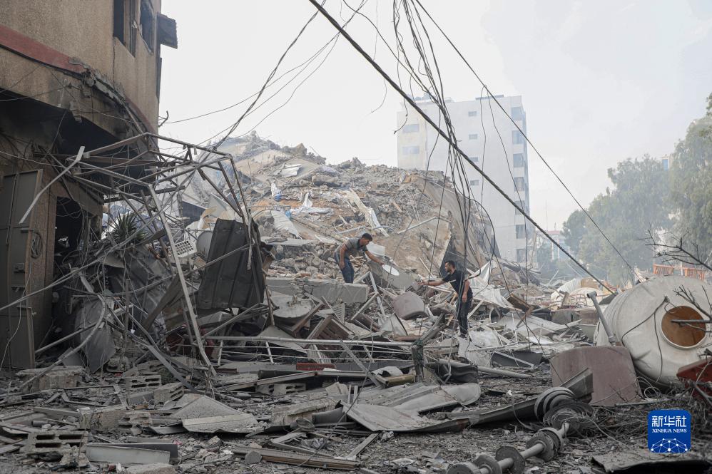 10月8日,在加沙城,巴勒斯坦人查看以色列空襲后的建筑廢墟。