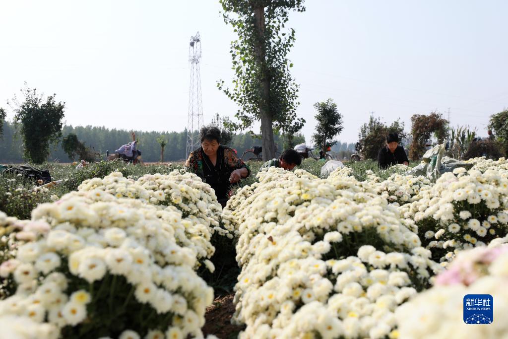 10月8日,在邢臺(tái)市任澤區(qū)大屯鄉(xiāng)的一處菊花種植基地,村民們收獲菊花。