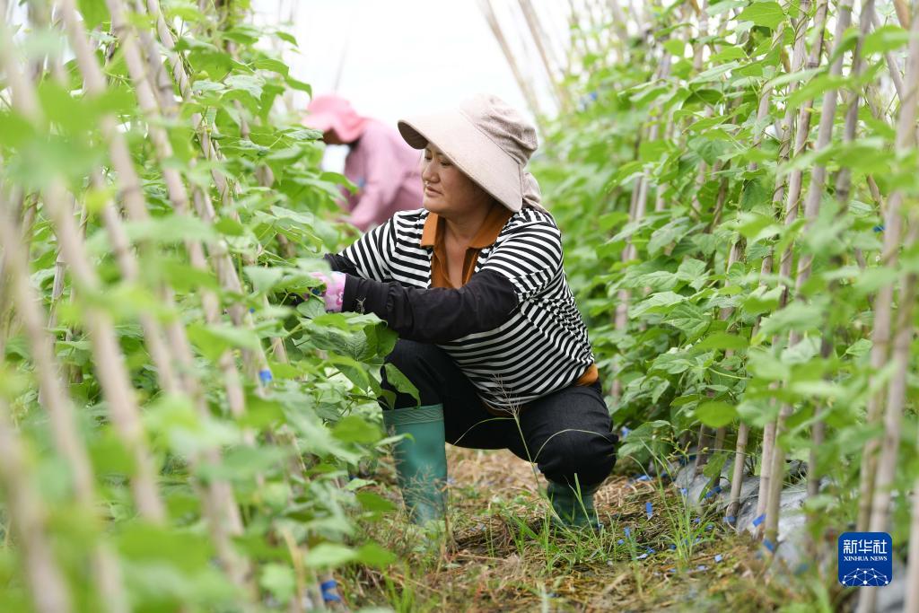 10月8日,村民在貴州省黔東南苗族侗族自治州黃平縣舊州鎮東門村田間管護四季豆。