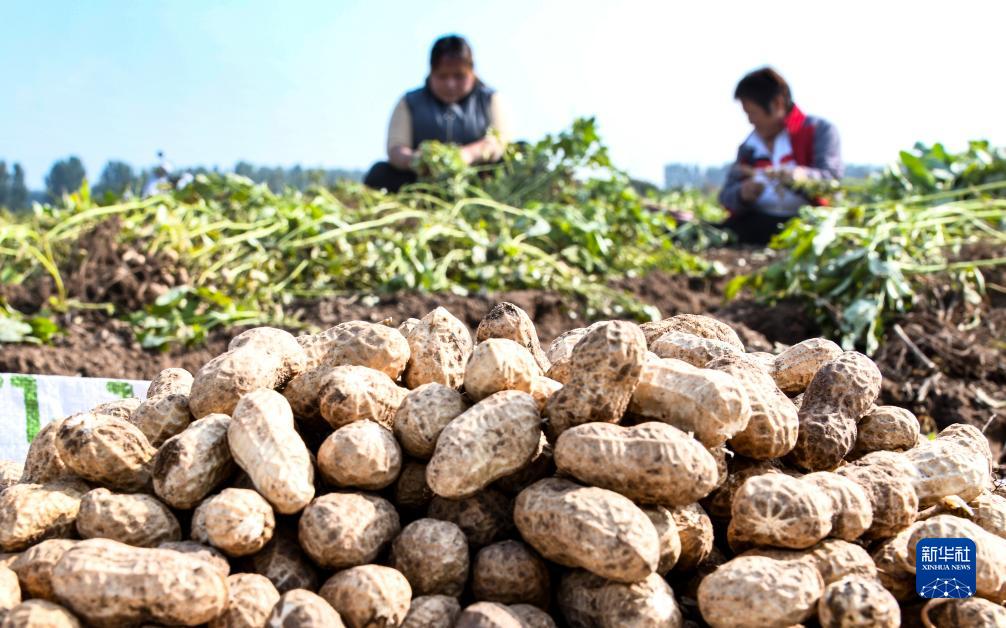 10月8日,河南省濟(jì)源市五龍口鎮(zhèn)農(nóng)民在田間收獲花生。