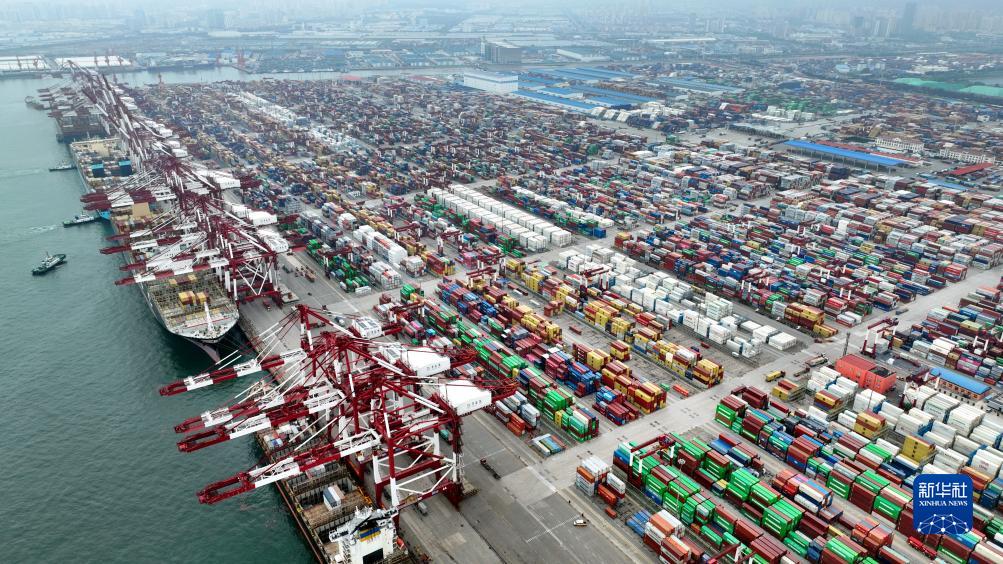 這是2022年7月29日拍攝的繁忙的山東港口青島港前灣集裝箱碼頭(無人機(jī)照片)。