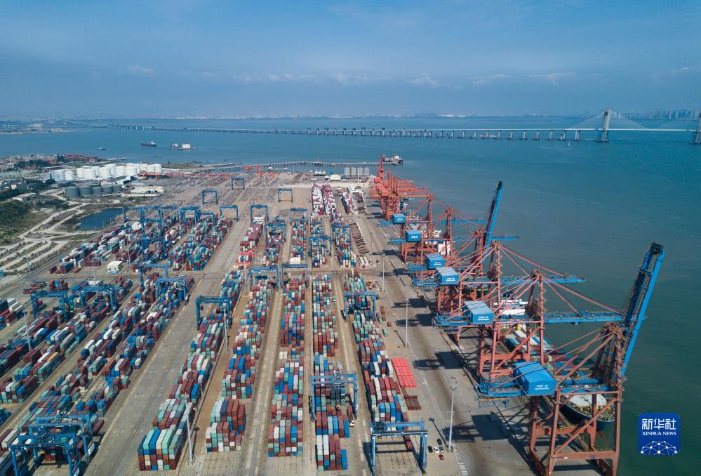 在泉州最主要的現代集裝箱港石獅石湖港,大型機械在吊裝集裝箱(2020年7月15日攝)。