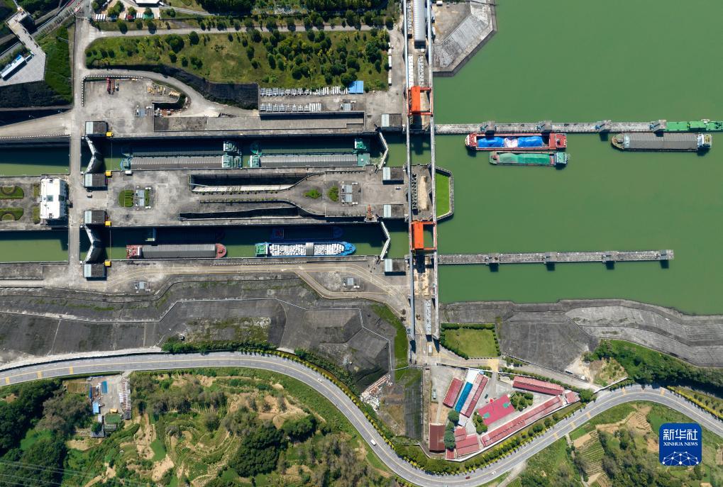 10月8日,在湖北省宜昌市,船舶有序通過三峽雙線五級船閘(無人機照片)。