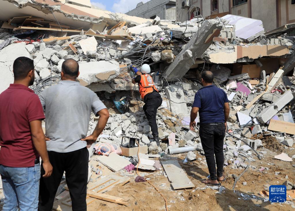 10月8日,在加沙地帶南部城市汗尤尼斯,人們在以色列空襲后的建筑廢墟中搜尋幸存者。