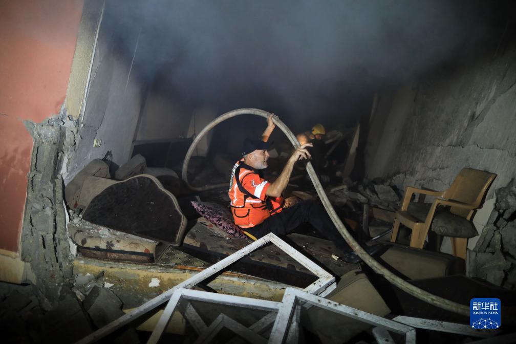 10月8日,巴勒斯坦民防人員在加沙地帶南部城市汗尤尼斯一處被以色列空襲的民宅滅火。
