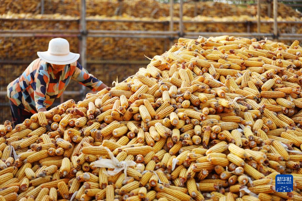 10月9日,山東省臨沂市郯城縣郯城街道農(nóng)民在整理豐收的玉米。