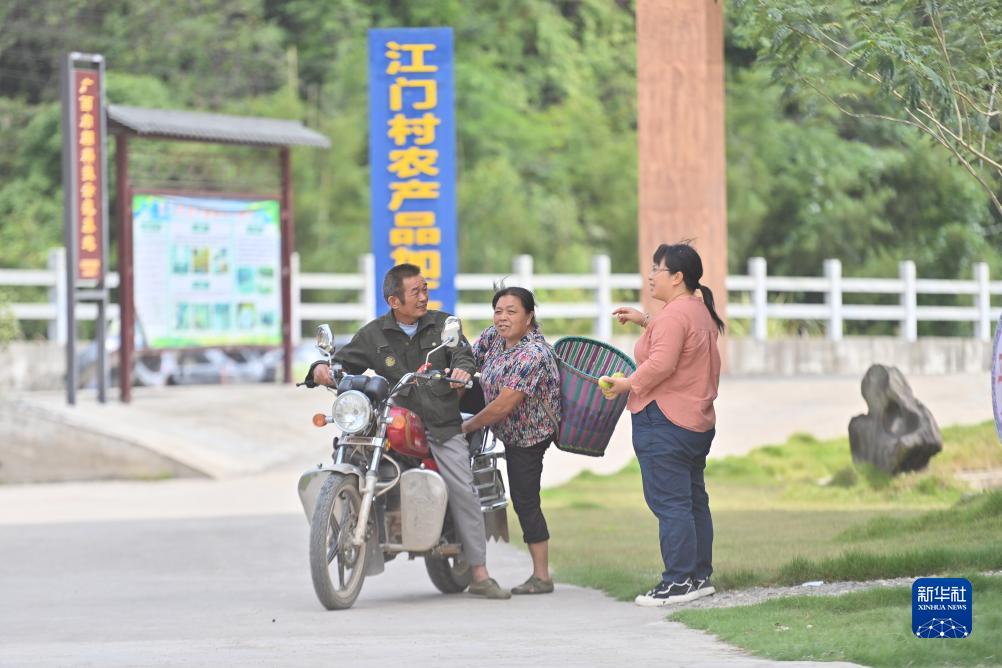 楊寧(右一)和送百香果到加工廠的村民交流(10月8日攝)。新華社記者 黃孝邦 攝