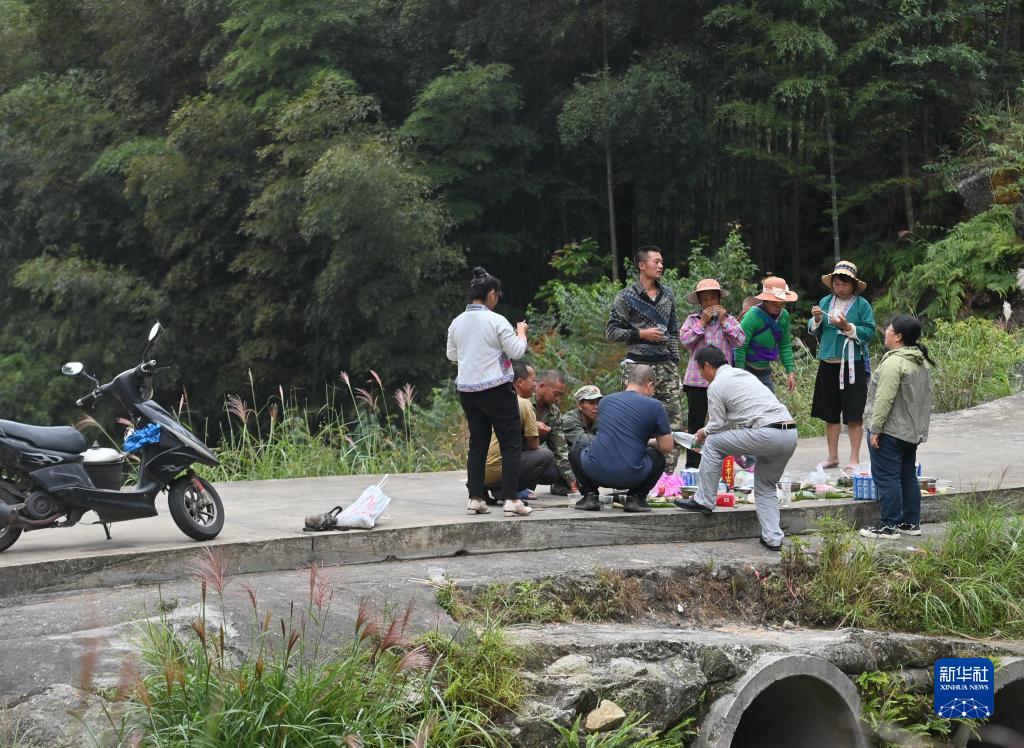 楊寧(右一)和鄰村(吉曼村)村民們?cè)谔镞呉贿叧晕顼垼贿厖f(xié)商山泉水引水工程相關(guān)事宜(10月8日攝)。新華社記者 黃孝邦 攝