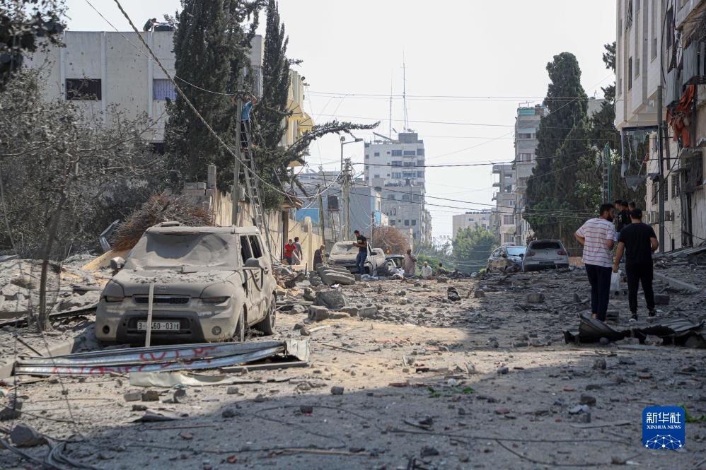 10月8日,巴勒斯坦人在加沙城查看以色列空襲后的街道。