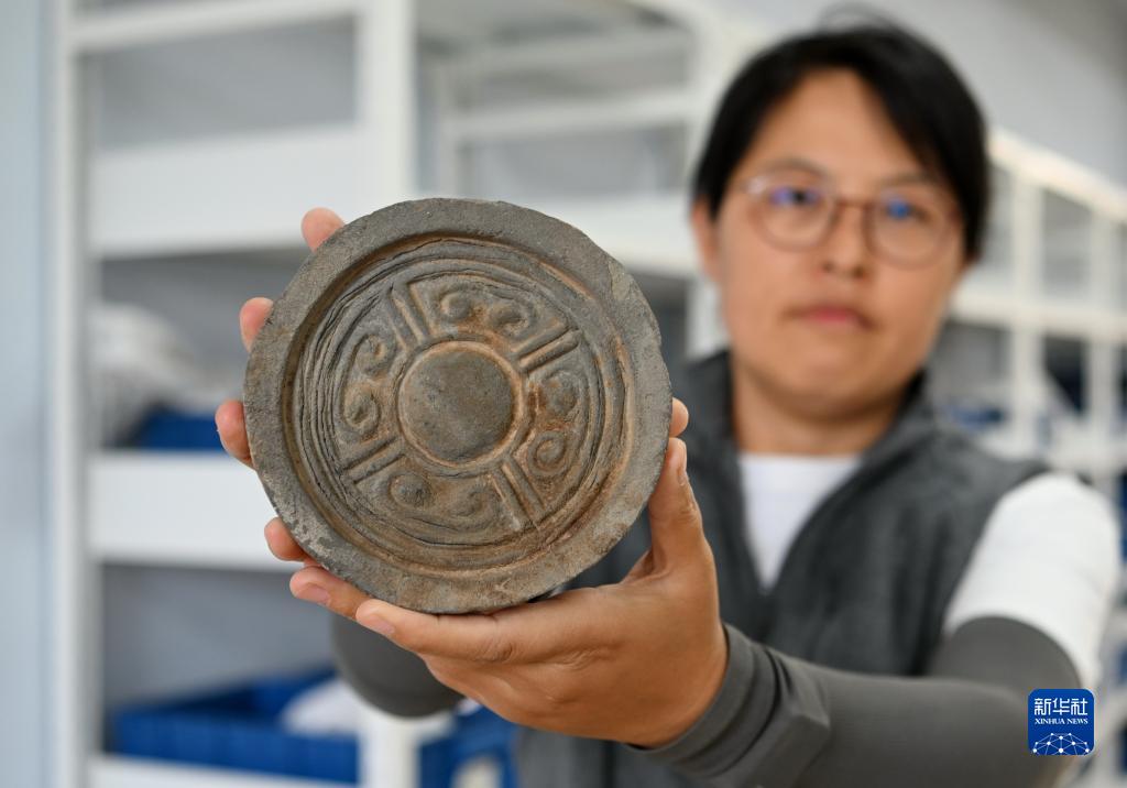 10月8日,考古隊員展示柏人城遺址出土的瓦當。