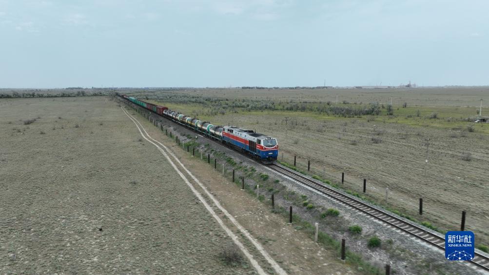 5月12日,在哈薩克斯坦阿拉木圖附近,貨運(yùn)列車(chē)馳騁于阿拉木圖與霍爾果斯間(無(wú)人機(jī)照片)。
