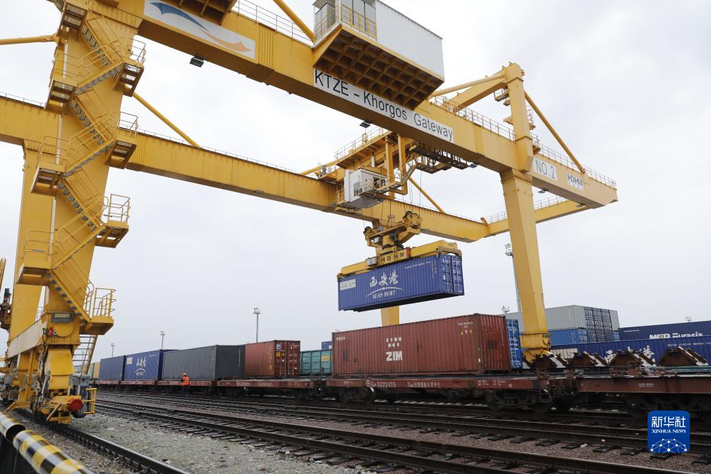 2022年5月19日,在哈薩克斯坦南部中哈邊境地區的“霍爾果斯-東大門”無水港內,龍門吊正在工作。