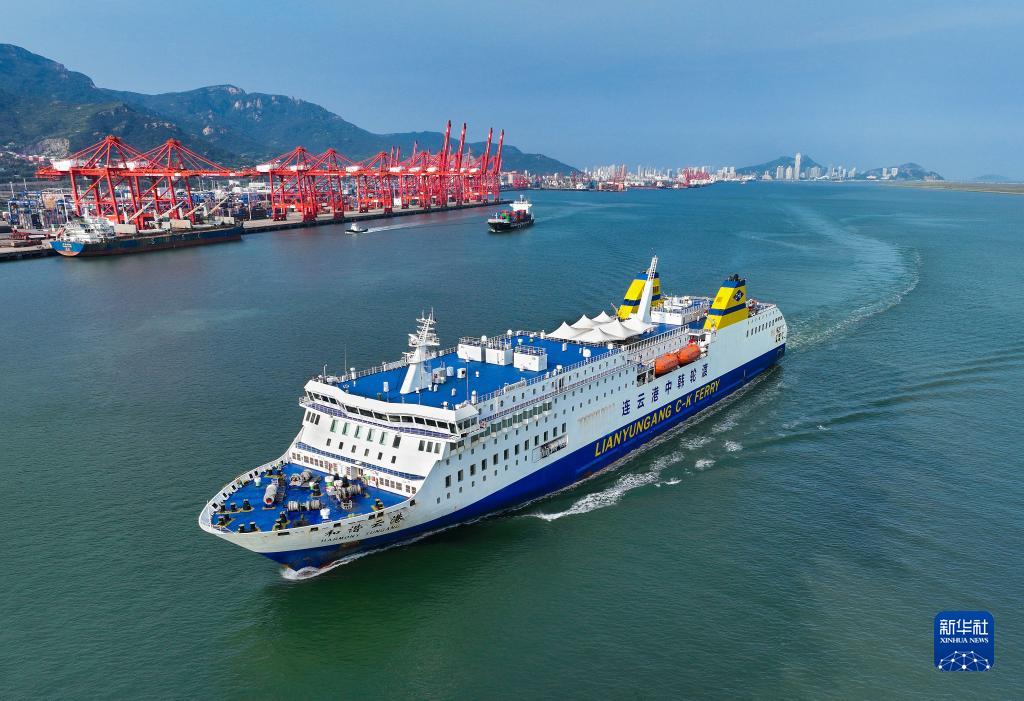 2022年9月7日,一艘遠(yuǎn)洋輪船從江蘇連云港港駛出(無(wú)人機(jī)照片)。