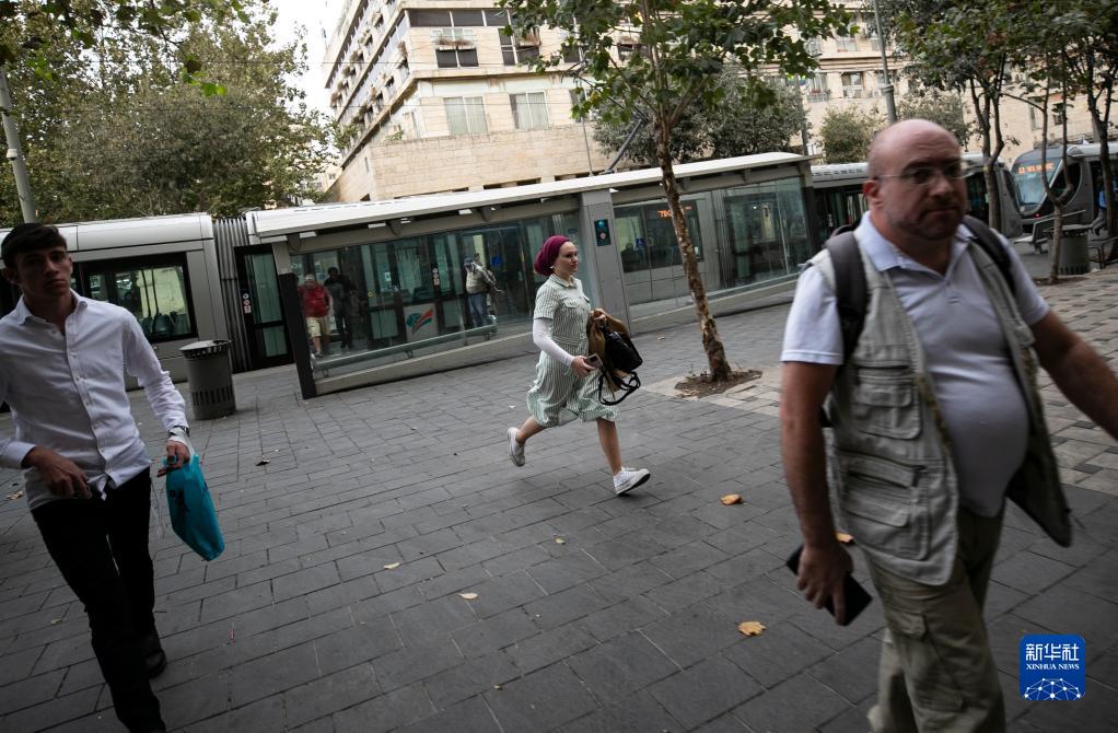 10月9日,在耶路撒冷街頭,人們?cè)诜揽站瘓?bào)響起時(shí)沖向避難設(shè)施。