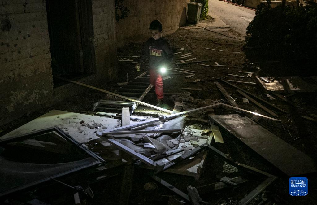 10月9日,在耶路撒冷以西的阿布高什村,一名兒童走過遭火箭彈破壞的建筑廢墟。