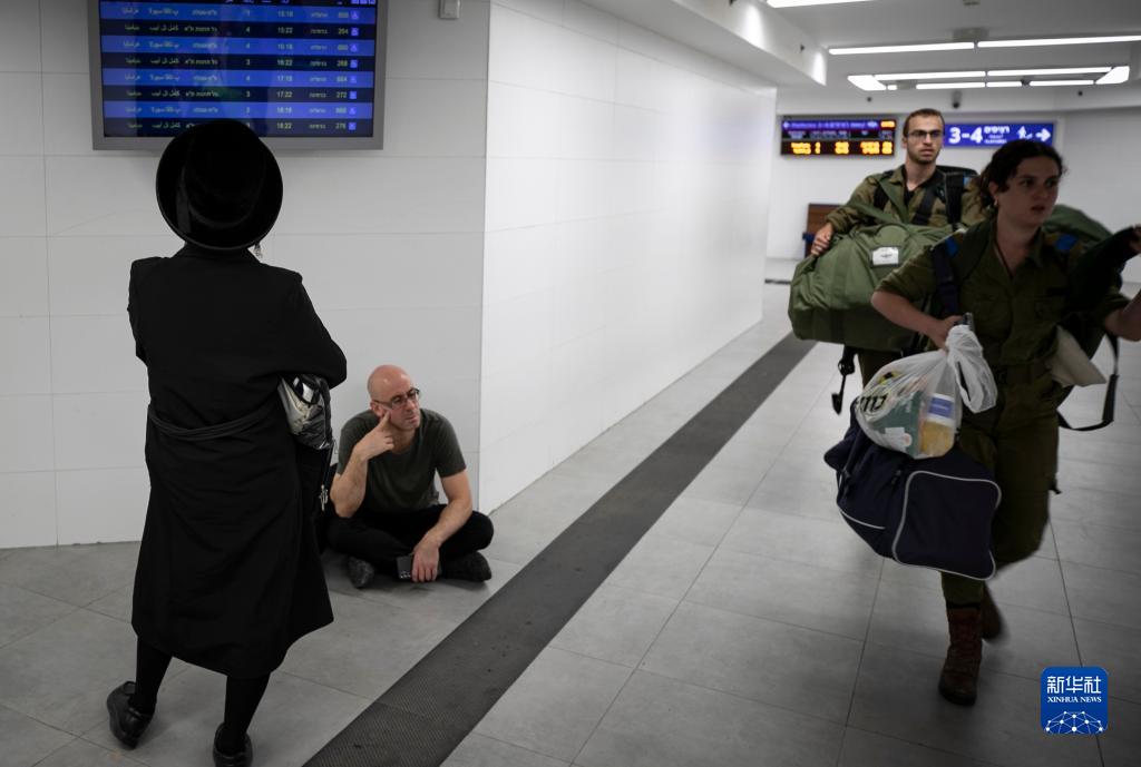 10月9日,在以色列南部城市阿什凱隆火車站,以軍士兵搭乘列車抵達(dá)。