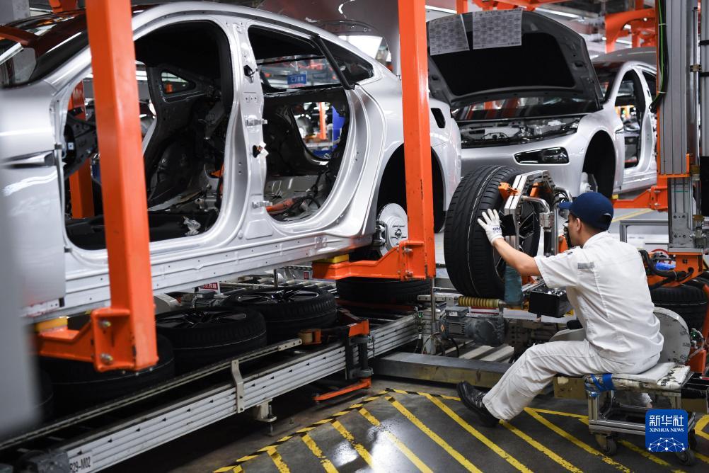 10月9日,工作人員在廣東肇慶小鵬汽車智能網聯科技產業園內的總裝生產線上工作。